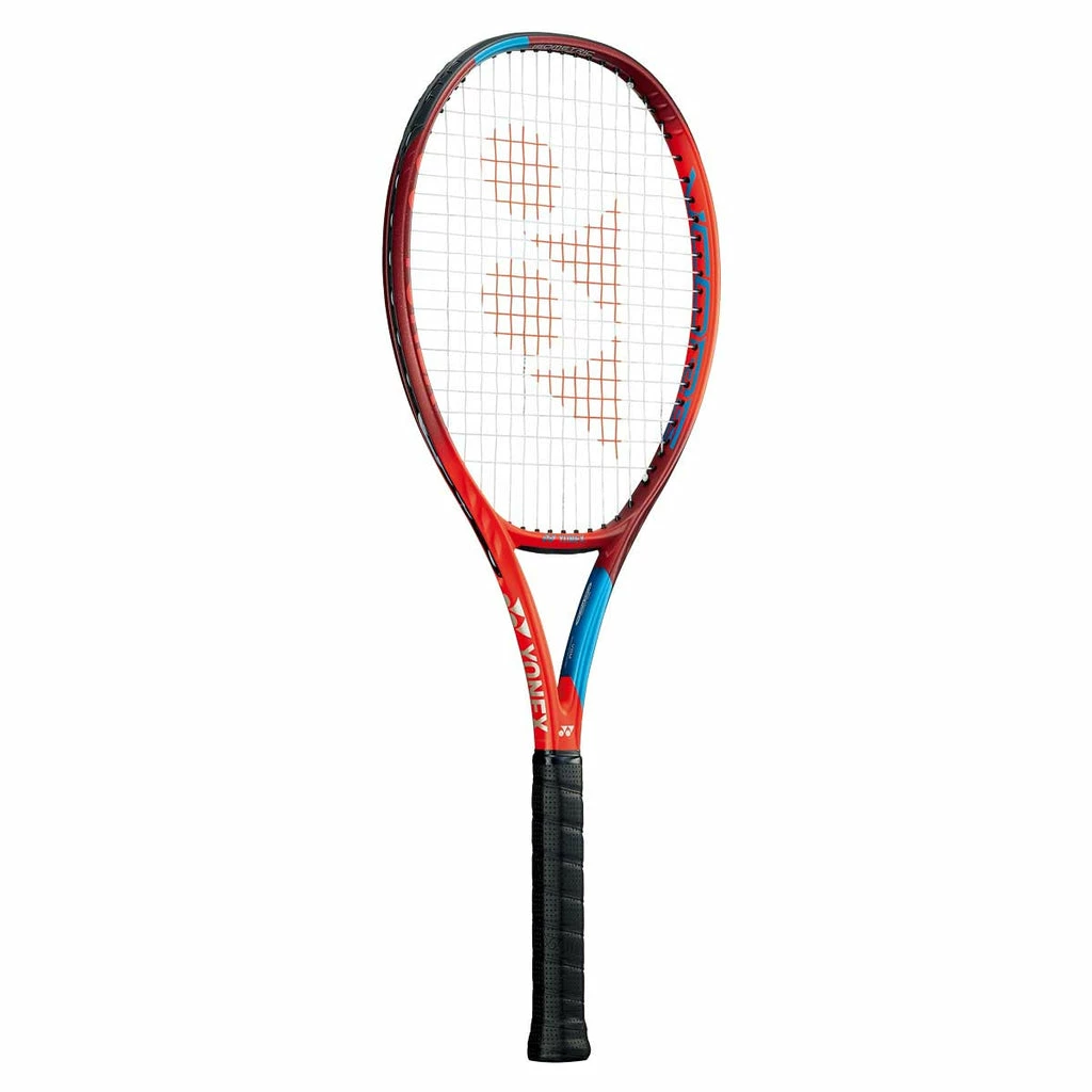 The 6th generation of Yonex VCORE continues a legacy of forgiving frames with excellent spin. The Yonex VCORE 100 is the quintessential all-around racquet for players that want maneuverability with spin and power at their fingertips. Endorsed by a wide range of players, this frame is updated with impressive power and spin. The racquet head features a wider upper half, where players make contact, that combines with the isometric head shape for crushing power and forgiveness. The racquet head has a thinner beam width in the upper hoop to deliver faster racquet head speed and more feel and response to the player. The new frame composition features a transformation (2G-Namd Flex Force) of Namd graphite. The result is a racquet that delivers a lot of feel with plenty of extra flex and snapback for maximum spin potential. Improving string movement and snapback, Yonex has included its unique String Sync Grommets at 12 and 6 o’clock to let the main strings move in sync. Vibration Dampening Mesh in the racquet handle mitigates unwanted vibrations while Aero Trench and Aero Fin Technology continue from previous generations to reduce air resistance. The VCORE 100 has a 16×19 string pattern that grips the ball for great spin potential while also delivering control to give you confidence on big points. Overall the Yonex VCORE 100 (300g) tennis racquet delivers on all areas of the court with power, forgiveness and control. Maneuverable from the baseline to the net, this is a truly versatile option for singles and doubles players that want more from their racquet.